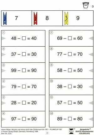 Den ZR bis 100 erobern - leicht gemacht mit Colorclips! Mithilfe der Reihe "Mit Plus und Minus durch den Zahlenraum" lassen sich die Zahlenräume bis 10, bis 20, bis 100, bis 1000 und bis 1 000 000 leicht erobern. Die gut strukturierten Übungen lassen sich im Kopf rechnen. Wechselnde Platzhalter sorgen für Abwechslung bei der Durchführung der Rechenoperationen.