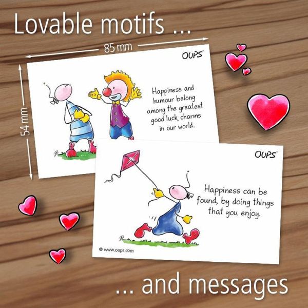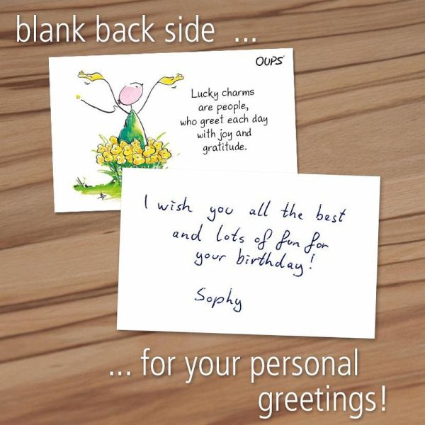 The Oups greeting cards are the perfect way to have a small gesture of kindness ready for loved ones at any time. Designed in business card format, these cards are easy to carry and deliver heartwarming thoughts in just the right moments.Whether as a lucky charm for the next academic challenge, a pick-me-up for a best friend, a token of appreciation for helpful individuals, or a sweet message for your significant other alongside their morning coffee, these lovingly designed cards bring a smile to any situation. A small gesture with a big impact.The back of the card is available for personal messages, allowing you to add your unique touch.Mit den Oups-Spruchkärtchen hat man jederzeit eine kleine Aufmerksamkeit für liebe Menschen dabei. Im Visitenkarten-Format sind die Kärtchen leicht eingesteckt und sorgen für schöne Gedanken in den richtigen Momenten. Ob als Glücksbringer zur nächsten schulischen Herausforderung, zur Aufmunterung für die beste Freundin, als Dankeschön für hilfsbereite Menschen oder als kleine Botschaft für die Liebste/ den Liebsten zum Frühstückskaffee. Die liebevoll gestalteten Kärtchen zaubern in allen Momenten ein Lächeln ins Gesicht. Eine kleine Aufmerksamkeit mit großer Wirkung. Für persönliche Worte steht die Rückseite zur Verfügung.© werteArt Verlag,Illustration: Günter Bender und Johannes BöttingerTexte: Kurt HörtenhuberUrheberin Figur Oups: Conny Wolf