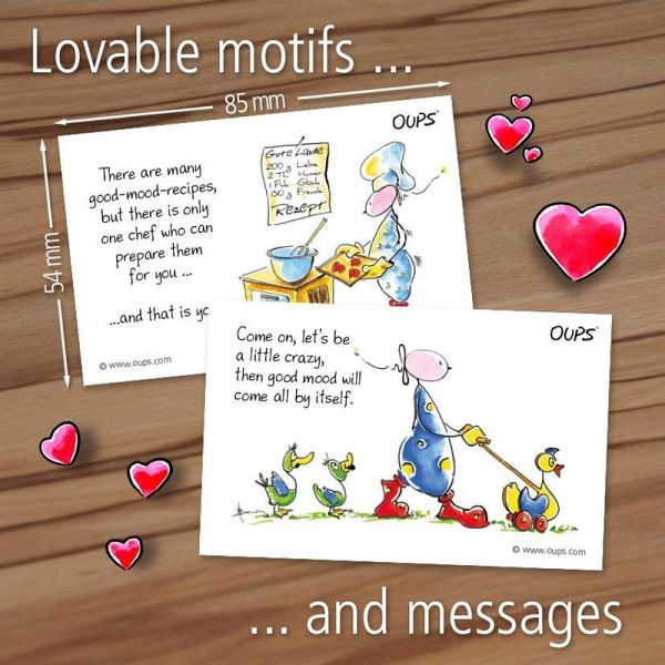 The Oups greeting cards are the perfect way to have a small gesture of kindness ready for loved ones at any time. Designed in business card format, these cards are easy to carry and deliver heartwarming thoughts in just the right moments.Whether as a lucky charm for the next academic challenge, a pick-me-up for a best friend, a token of appreciation for helpful individuals, or a sweet message for your significant other alongside their morning coffee, these lovingly designed cards bring a smile to any situation. A small gesture with a big impact.The back of the card is available for personal messages, allowing you to add your unique touch.Mit den Oups-Spruchkärtchen hat man jederzeit eine kleine Aufmerksamkeit für liebe Menschen dabei. Im Visitenkarten-Format sind die Kärtchen leicht eingesteckt und sorgen für schöne Gedanken in den richtigen Momenten. Ob als Glücksbringer zur nächsten schulischen Herausforderung, zur Aufmunterung für die beste Freundin, als Dankeschön für hilfsbereite Menschen oder als kleine Botschaft für die Liebste/ den Liebsten zum Frühstückskaffee. Die liebevoll gestalteten Kärtchen zaubern in allen Momenten ein Lächeln ins Gesicht. Eine kleine Aufmerksamkeit mit großer Wirkung. Für persönliche Worte steht die Rückseite zur Verfügung.© werteArt Verlag,Illustration: Günter Bender und Johannes BöttingerTexte: Kurt HörtenhuberUrheberin Figur Oups: Conny Wolf