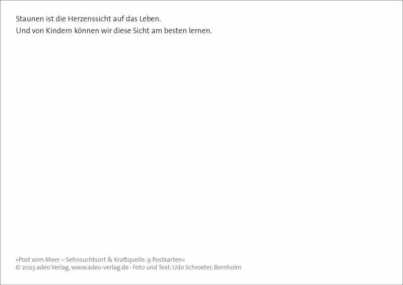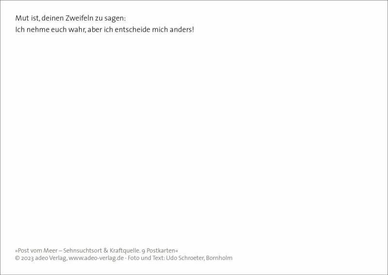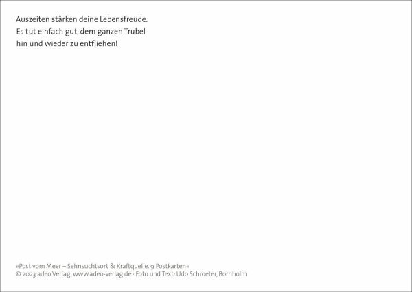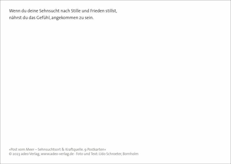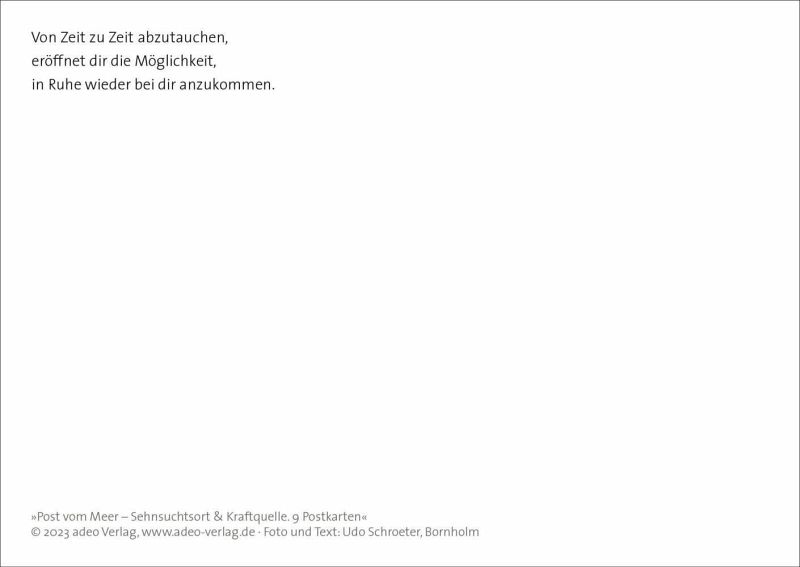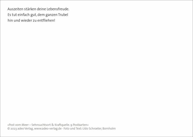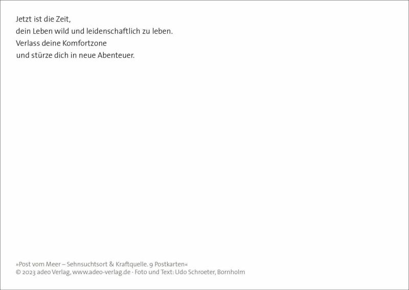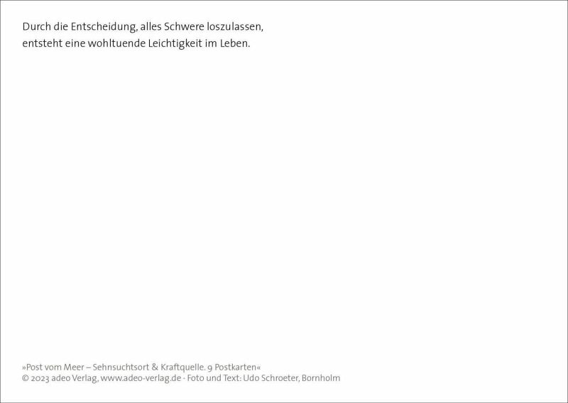 Das Meer - für viele Sehnsuchtsort und Kraftquelle. Mit der Weite des Horizonts im Blick sieht der Alltag gleich ganz anders aus und wir sammeln Kraft, um Neues zu wagen, Schweres loszulassen und hoffnungsvoll in die Zukunft zu schauen. Und der Wind pustet uns eine Portion Gelassenheit ins Gesicht. Das Postkartenset "Post vom Meer" hat diese Momente wie in einer Flaschenpost konserviert. Die inspirierenden Gedanken von Bestseller-Autor Udo Schroeter hallen nach und fangen die Atmosphäre seines Kraftortes ein. Die in Deutschland auf raue Holzschliffpappe gedruckten Meermotive sind ein vielseitiges Geschenk und eine inspirierende Dekoration für alle, die auf den nächsten Urlaub am Meer hin fiebern.