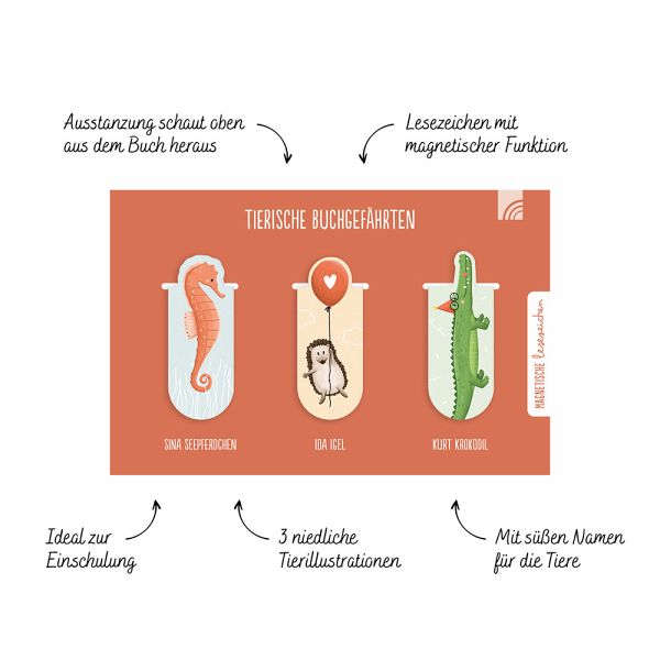 Kleine Mutmacher sollen unsere neuen Magnetlesezeichen sein. Leseliebhabern wird damit keine Seite mehr verloren gehen, weil zum Beispiel das Lesezeichen herausgerutscht ist. Die liebevoll gestalteten, handgezeichneten Motive stammen von Grafikerin Annika Mengel und sprechen in verschiedenen Lebenslagen an. Während die tierischen Buchgefährten Willi Wal, Didi Dackel, Alma Alpaka, Sina Seepferdchen, Ida Igel und Kurt Krokodil Kindern das Lesen näherbringen und ihre Freude daran steigern, bieten die kleinen Mutmacher und treuen Wortbegleiter mit berührenden Bibelzitaten und ansprechenden Zusprüchen eine besondere Lesezeit.