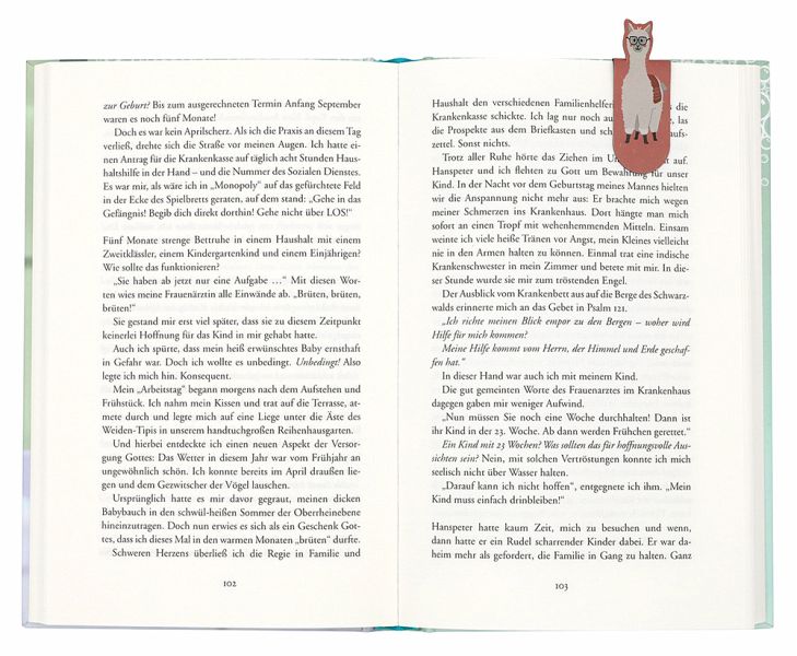 Leseliebhabern wird damit keine Seite mehr verloren gehen, weil zum Beispiel das Lesezeichen herausgerutscht ist. Die liebevoll gestalteten, handgezeichneten Motive stammen von Grafikerin Annika Mengel und sprechen in verschiedenen Lebenslagen an. Während Willi Wal, Didi Dackel und Alma Alpaka Kindern das Lesen näherbringen und ihre Freude daran steigern, bieten die kleinen Mutmacher und treuen Wortbegleiter mit berührenden Bibelzitaten und ansprechenden Zusprüchen eine besondere Lesezeit.