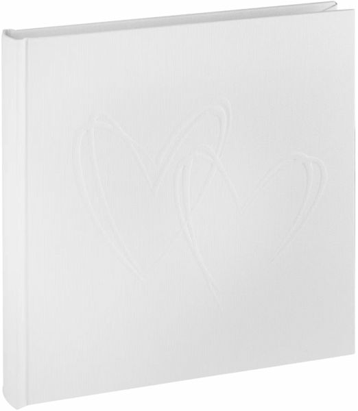 Buchgebundenes Fotoalbum mit Leineneinband und mit einer Blindprägung in Herzform veredelt. Das Album im Format 20x20 cm hat 40 weisse Seiten aus säurefreiem Fotokarton. Ohne Pergamin.